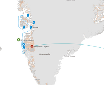 Il primo giorno arrivo a Kangerlussuaq, l'unica città interna della Groenlandia e un nodo aereo chiave con una ricca storia legata alla Guerra Fredda. E' previsto un volo di collegamento per l'imbarco da Copenaghen a Kangerlussuaq con un Pacchetto di Avvicinamento. All'arrivo, ci trasferiamo con il gommone Zodiac all'Ocean Albatros, ci sistemiamo nelle nostre cabine, completiamo un'esercitazione di sicurezza e poi brindiamo con champagne mentre iniziamo il nostro viaggio attraverso lo splendido fiordo di Kangerlussuaq.