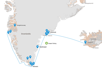 Questa crociera in navigazione di spedizione ha un itinerario di 12 giorni che collega l'Islanda alla Groenlandia, attraversando lo Stretto di Danimarca. Il programma si sviluppa lungo la costa orientale, meridionale e occidentale groenlandese, alternando soste in centri abitati (Tasiilaq, Nuuk, Kangaamiut) a navigazioni tecniche in aree a elevata densità di ghiaccio (Sermilikfjord, Prins Christian Sund). Imbarco dal porto di Reykjavik in Islanda e sbarco a Kangerlussuaq in Groenlandia dove è previsto un volo di rientro a Copenaghen in Danimarca.